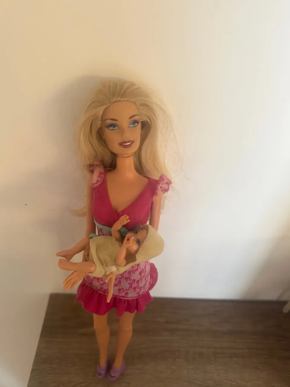 Barbie quero ser babá completa. O mecanismo atrás das costas balança o bebê. Está perfeita.