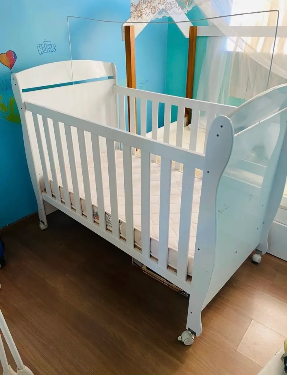 Berço branco , vai com colchão e 3 lençóis de malha , está em perfeito funcionamento.