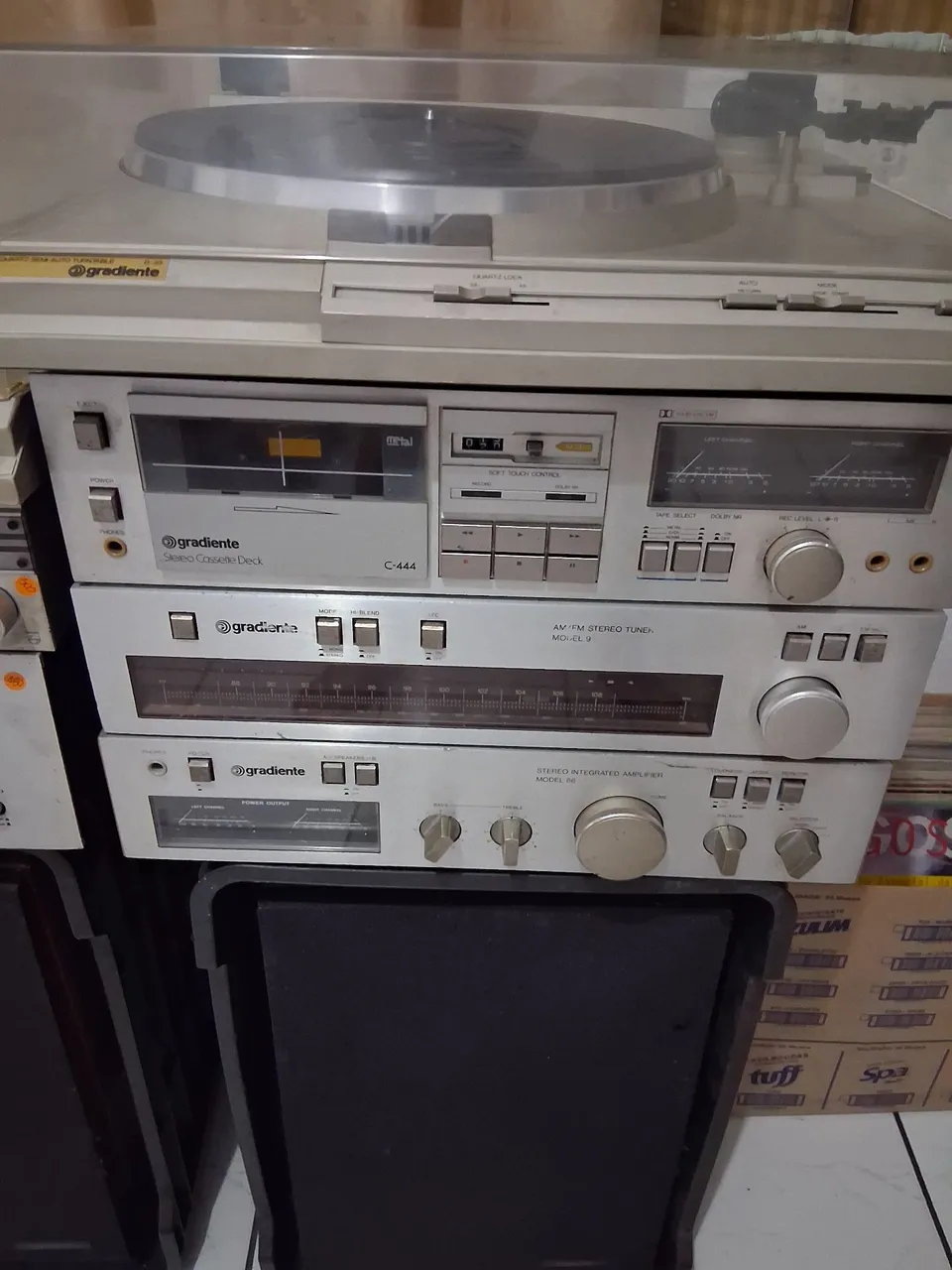 Apresentamos o conjunto Gradiente, um sistema de som completo que combina design clássico e qualidade sonora excepcional. Composto por toca-discos, deck de cassete e amplificador, este conjunto oferece uma experiência de áudio imersiva e nostálgica. Reviva suas músicas favoritas com este ícone da Gradiente! Conjunto Gradiente com tuner model 9 stereo, amplificador model 86, pick-up D30 com cápsula e agulha, e um deck c-444 que precisa fazer manutenção na correia por favor retirar no local bairro industrial contagem