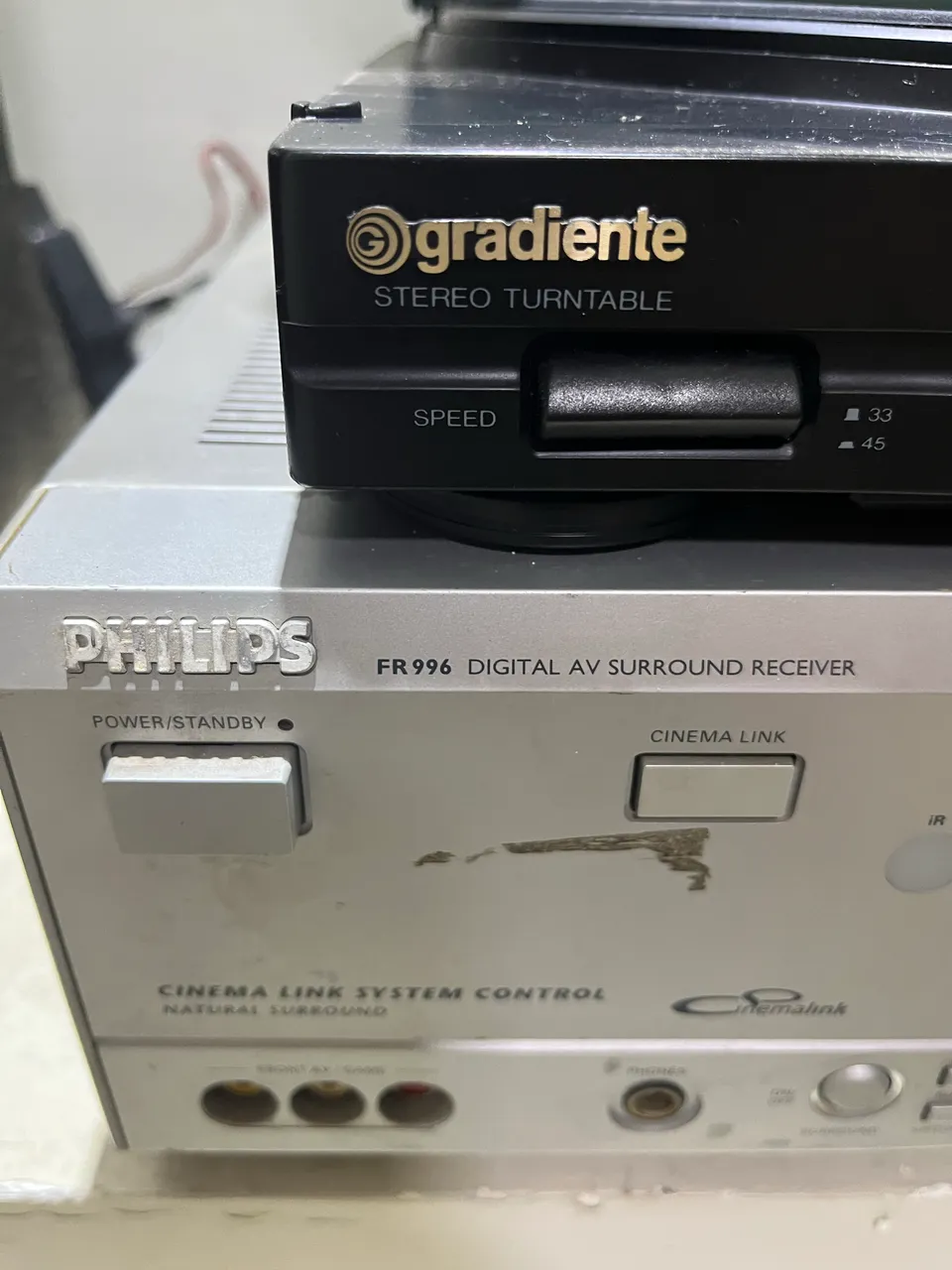 Toca discos Gradiente perfeito , sem trincados , agulha boa com receiver Philips , o receiver não funciona mais para home theater mas com o toca discos funciona normal só vendo o conjunto .