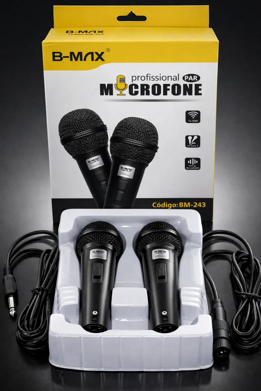Microfones profissionais B-Max, perfeitos para quem busca qualidade de áudio. Conjunto completo com dois microfones, ideal para diversas aplicações.