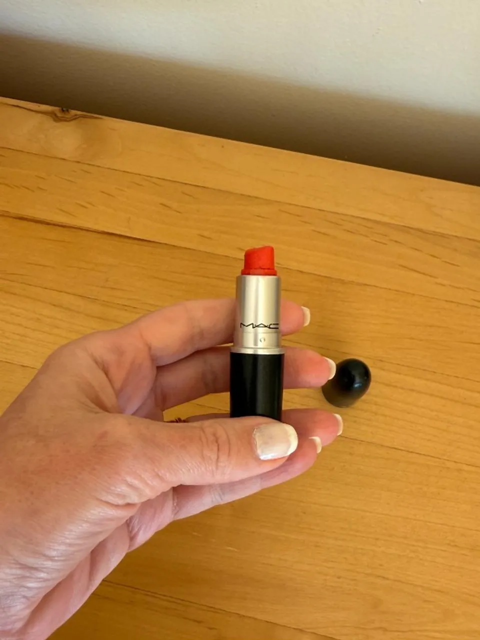 Batom MAC Morange, textura cremosa. O batom esta quebrado por queda, por isso o precinho camarada.