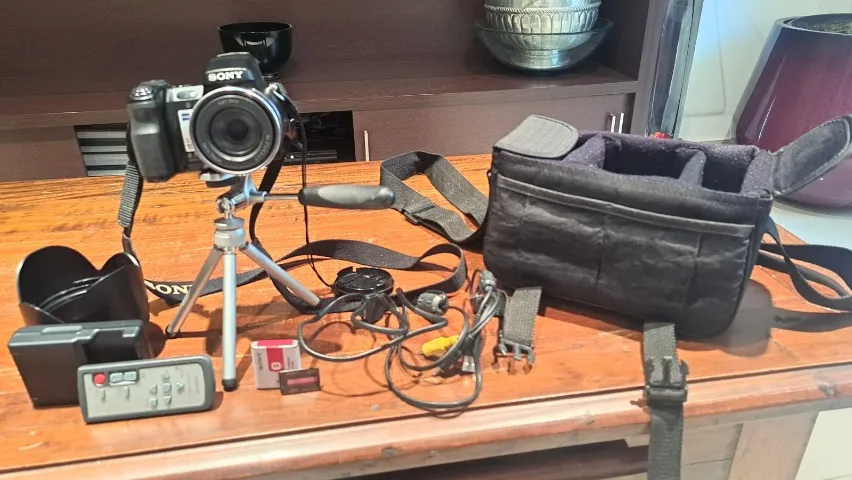 8.1 mega pixels, em ótimo estado, com diversos acessórios (alça, 2 carregadores, controle remoto, manual, bolsa, cartão de memória de 2 giga, cabos, bateria, protetor de lente e de sol e tripé). Ideal para iniciantes na fotografia ou para quem busca uma câmera compacta e versátil.