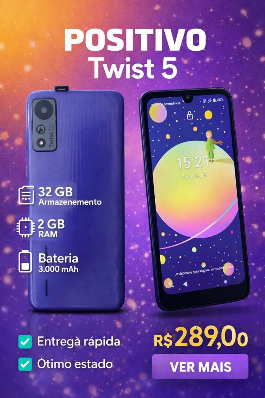 Descubra o Positivo Twist 5, um celular que combina design moderno com desempenho eficiente. Com 32GB de armazenamento e 2GB de RAM, você terá espaço de sobra para seus aplicativos e arquivos. Sua bateria de 3.000 mAh garante que você fique conectado por mais tempo. Adquira já o seu!