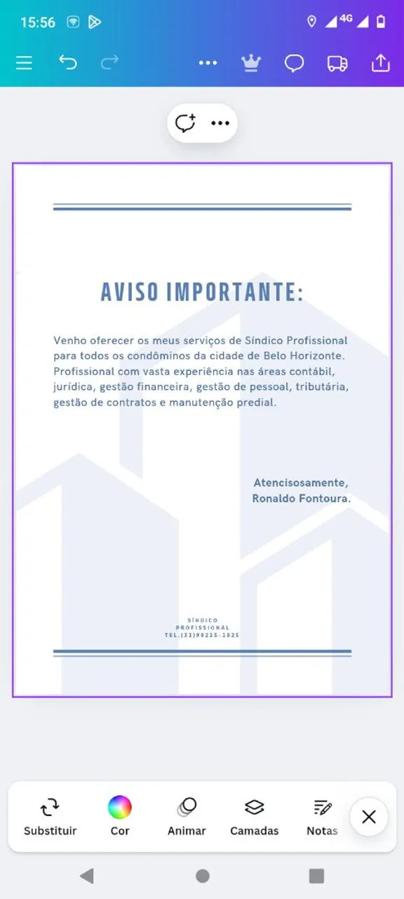 Venho oferecer os meus serviços de Síndico Profissional. Profissional qualificado com vasta experiência no ramo imobiliário. Venha e faça um orçamento. Contato: Ronaldo - Tel.
