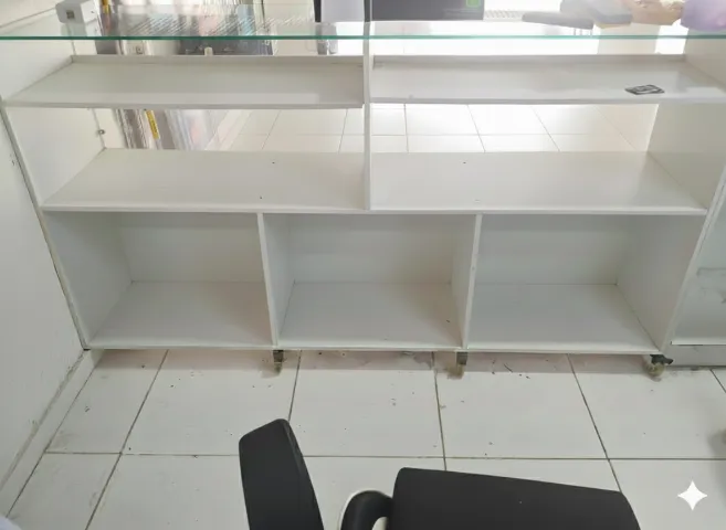 BALCAO MDF BRANCO COM VIDRO EM CIMA E NA FRENTE