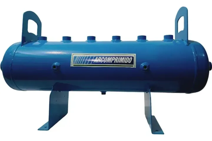 Distribuidor de ar comprimido DH25-6 (mod.1) com 02 conexões nas calotas, 01 de 2'' e 01 de 1". 06 saídas superior de 1". Luvas laterais para acessórios de segurança (manômetro e válvula de segurança) de 1/4'' e luva inferior de 1/4'' (dreno). Pressão máxima de trabalho 12,3kg/cm². Dimensões; Altura: 350 mm, Comprimento total: 1030 mm, Diametro corpo: 180mm, Altura total com alça de movimentação: 430 mm. Acompanha documentação com certificado de teste hidrostático. **Este anúncio não contempla os acessórios de segurança (manômetro, válvula de segurança e dreno - necessários para uso) -Opções de Conexões (ajustaveis com reduções e/ou bujões)
