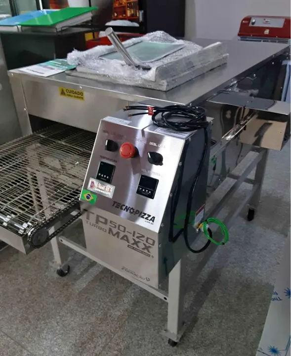 Máquina de Assar Pizza para pizzas e esfihas, capaz de assar massas até 50cm. Conta com uma capacidade de produção de até 90 pizzas/hora (massa crua); 1.600 esfihas/hora (massa crua). (Cálculo da produção/hora realizado com pizzas de 35cm, podendo variar de acordo com o tamanho da pizza, espessura da massa e quantidade de cobertura).