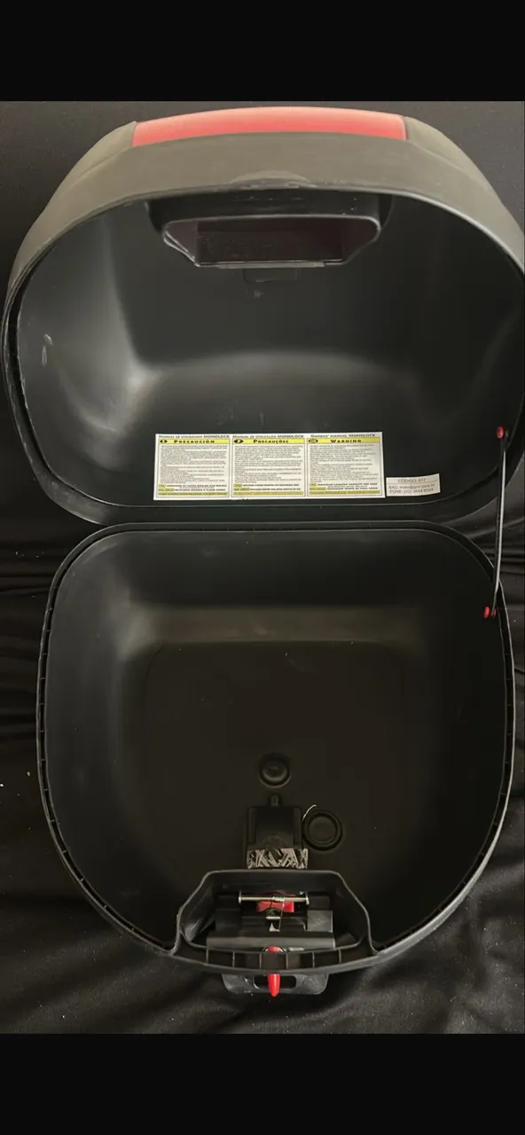 Baú de moto resistente e espaçoso para transportar seus pertences com segurança. Design moderno e fácil instalação. Ideal para o dia a dia e viagens.
