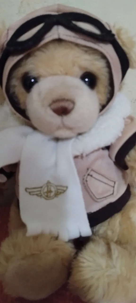 Lindo urso de pelúcia colecionável, com óculos de aviador e uniforme charmoso. Ideal para decoração ou presente. Perfeito estado de conservação.