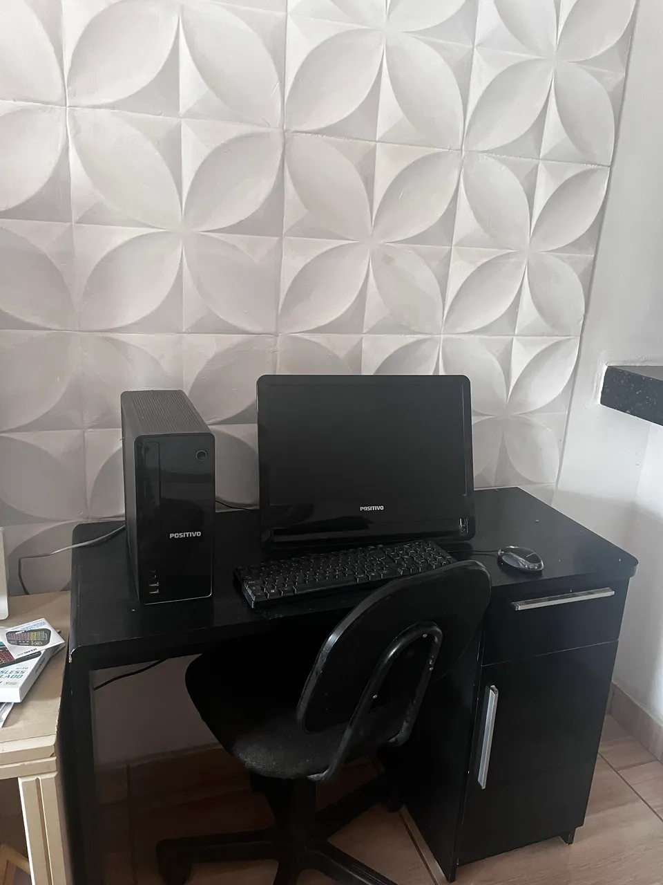Computador Positivo completo com mesa inclusa e cadeira, ideal para trabalho e estudos. Design compacto e eficiente.