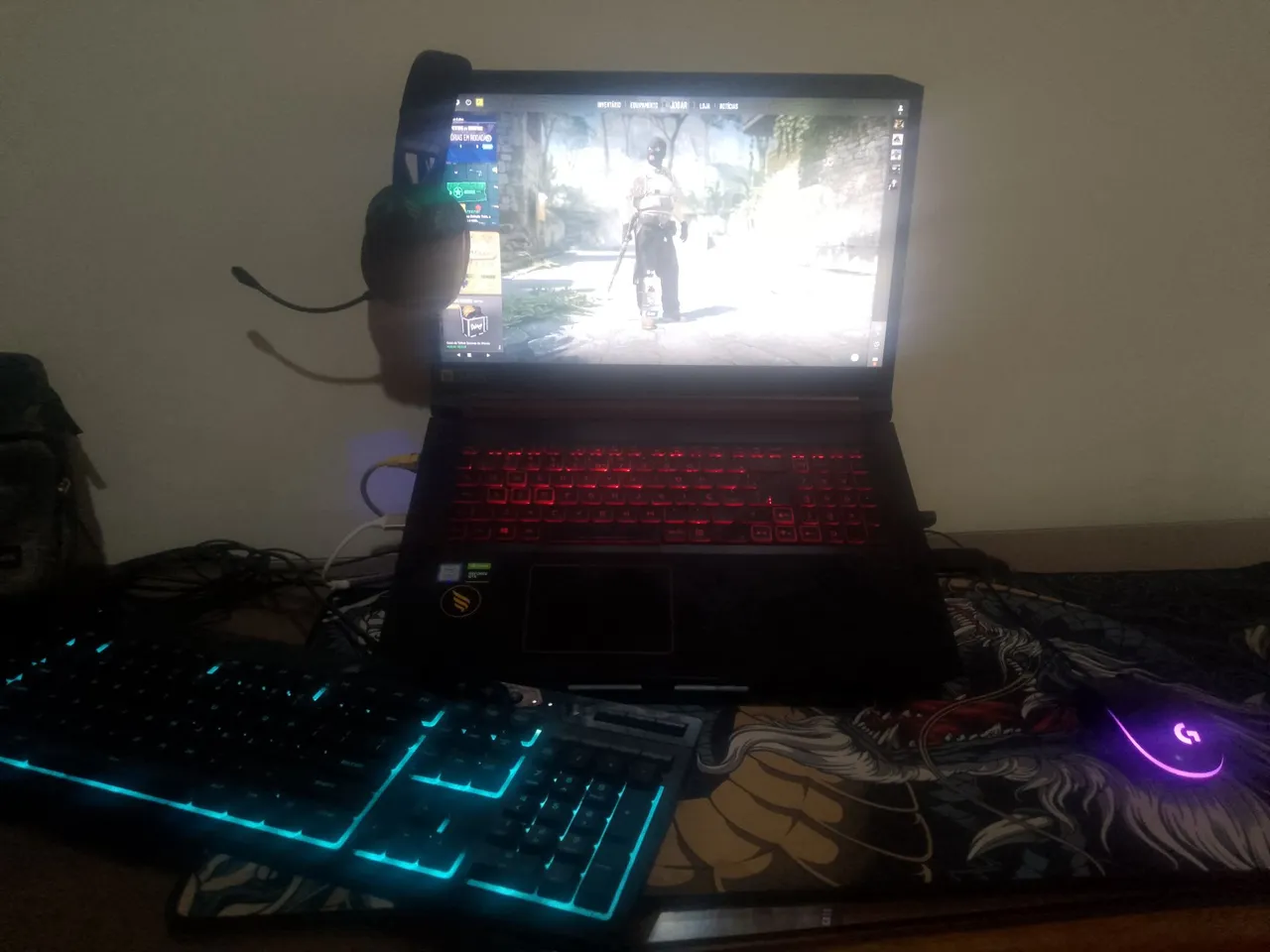 Acompanha base com cooler, mouse pad grande, mouse Logitech, teclado Corsair.