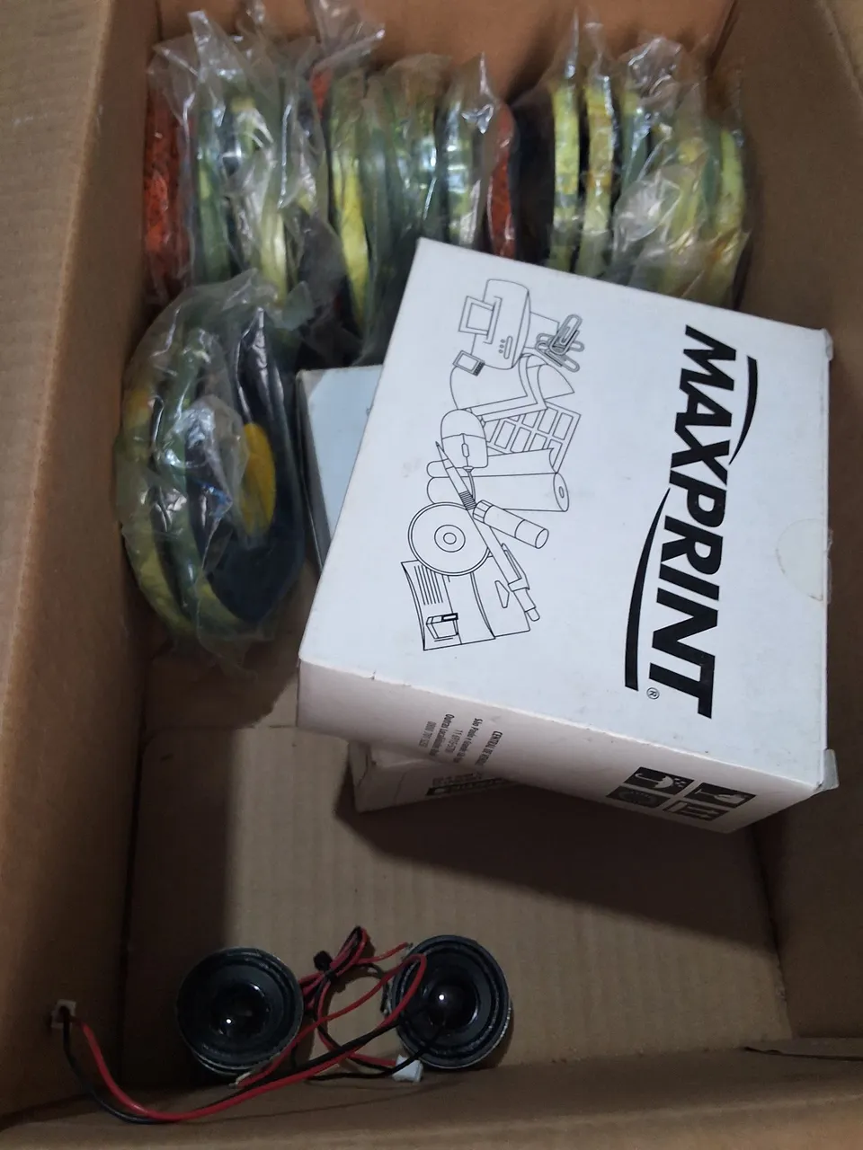 Peças de informática: 10 discos, 20 CDs virgens lacrados e 2 mini alto falantes.