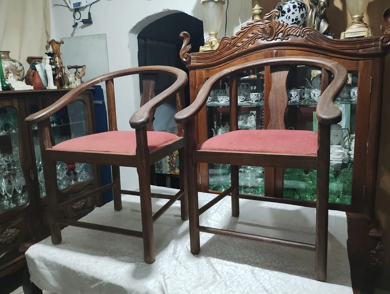 Par de cadeiras tipo namoradeira em sucupira estrutura em perfeito estado ta com o tecido do assento um pouco desbotada, tem que retirar no meio local, venda somente o par
