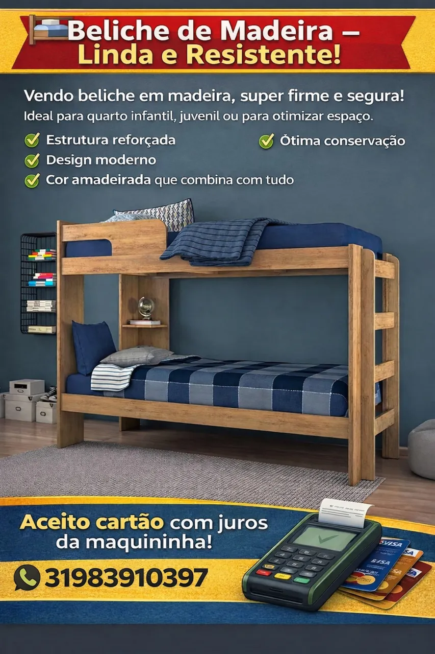 Beliche de madeira, linda e resistente, ideal para otimizar o espaço do quarto infantil ou juvenil. Possui estrutura reforçada, design moderno e ótima conservação.