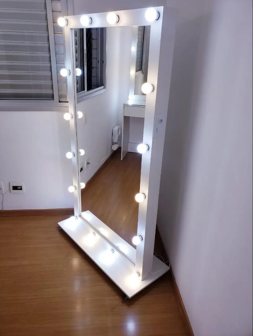 Espelho camarim com 16 lâmpadas, possui rodinhas, tomada e apagador. 1,75cm de altura e 90cm de largura