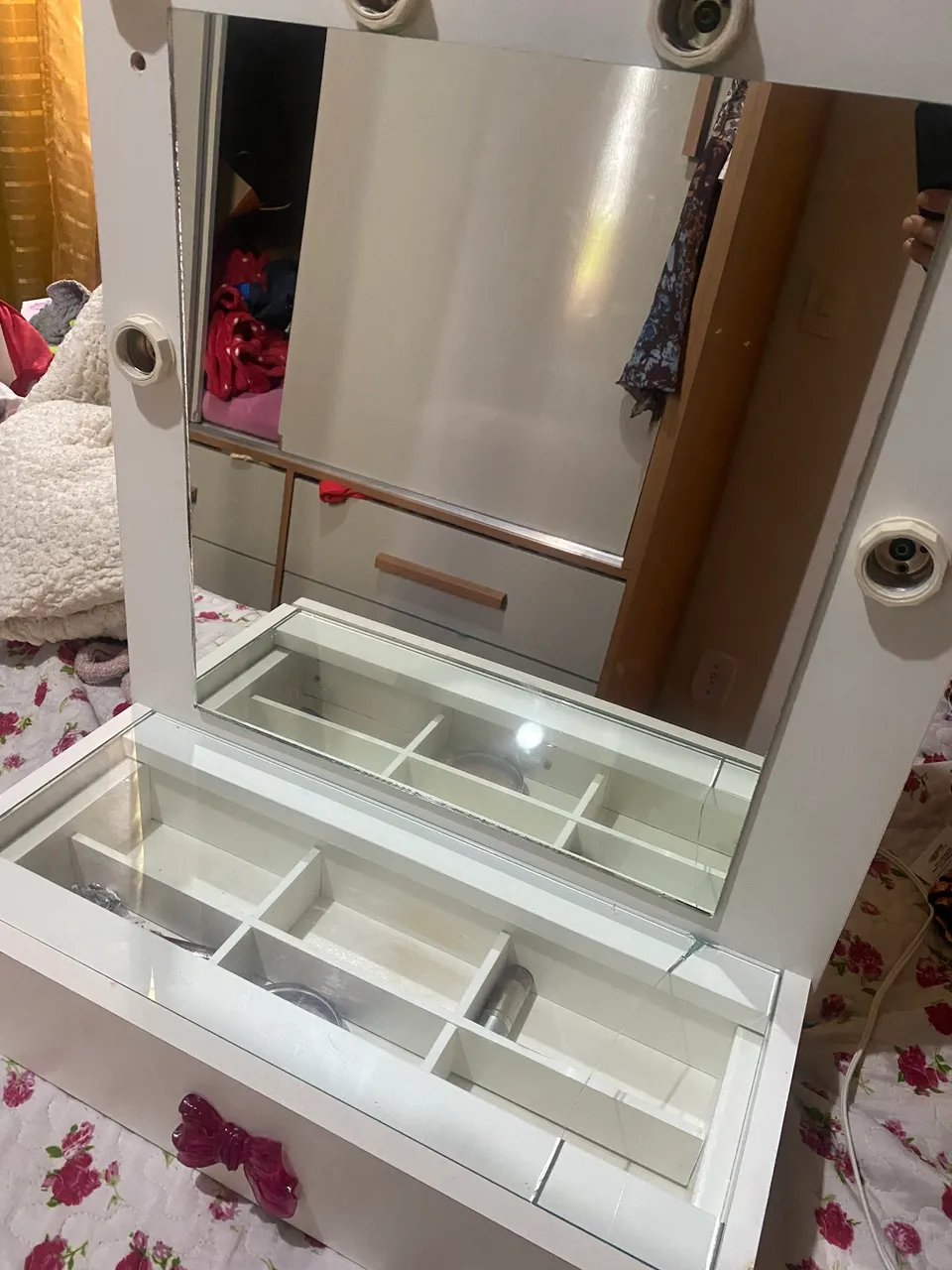 Linda penteadeira com design moderno e funcional, perfeita para organizar seus produtos de beleza e criar um espaço charmoso. So um detalhe vidro quebrou