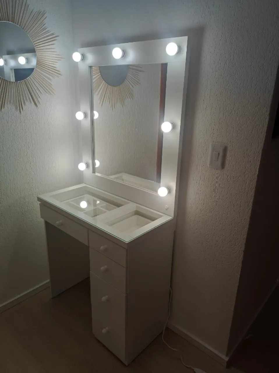Linda penteadeira com 5 gavetas, ideal para organizar seus cosméticos e maquiagens. Design moderno e funcional, perfeita para o seu cantinho de beleza.