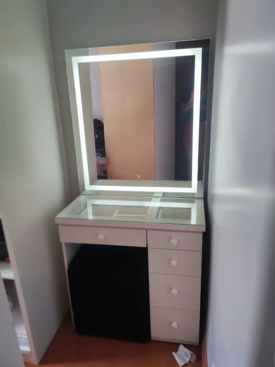 Linda penteadeira frontled com design moderno, perfeita para organizar seus produtos de beleza e criar um espaço charmoso. Espelho com iluminação embutida para facilitar a sua rotina.