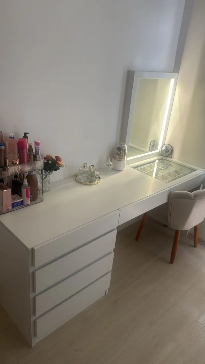 Linda penteadeira planejada, perfeita para organizar seus produtos de beleza e criar um espaço charmoso. Design moderno e funcional, ideal para quem busca praticidade e elegância. Móvel sem marcas de uso, completamente novo. O compartimento de vidro para armazenar produtos possui 20 divisórias.