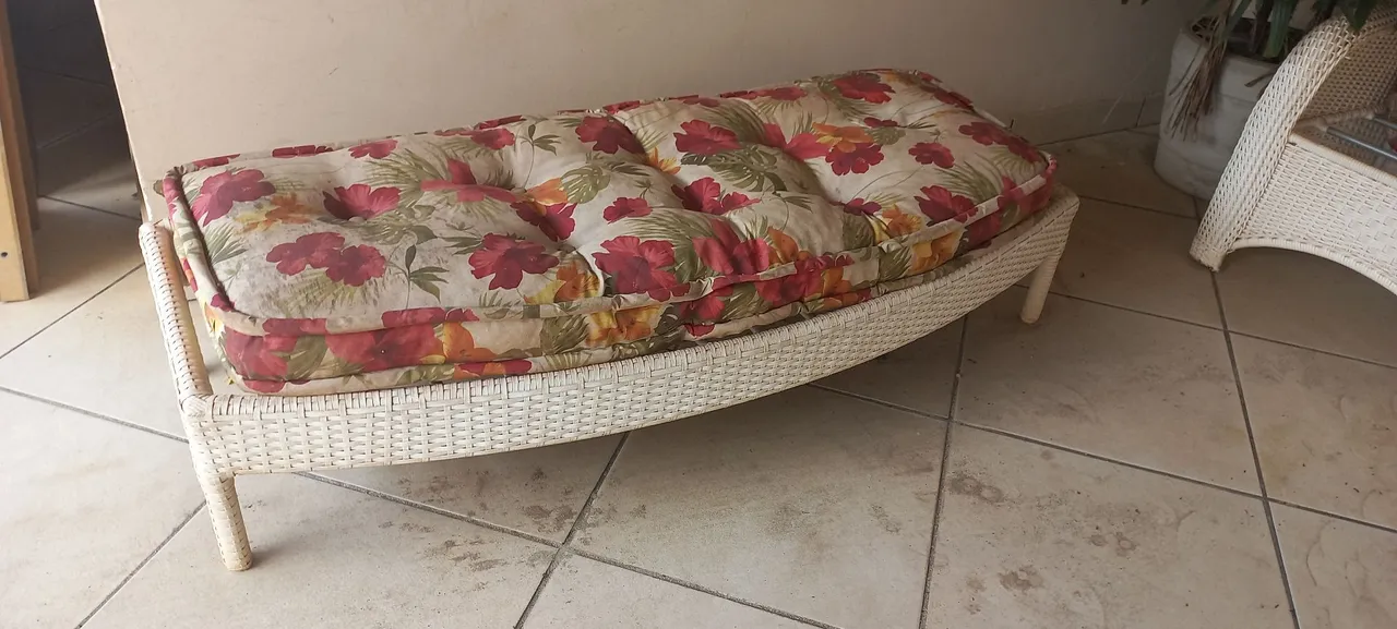 Lindo banco de fibra com almofada floral, perfeita para relaxar e decorar o seu ambiente. Design elegante e confortável.