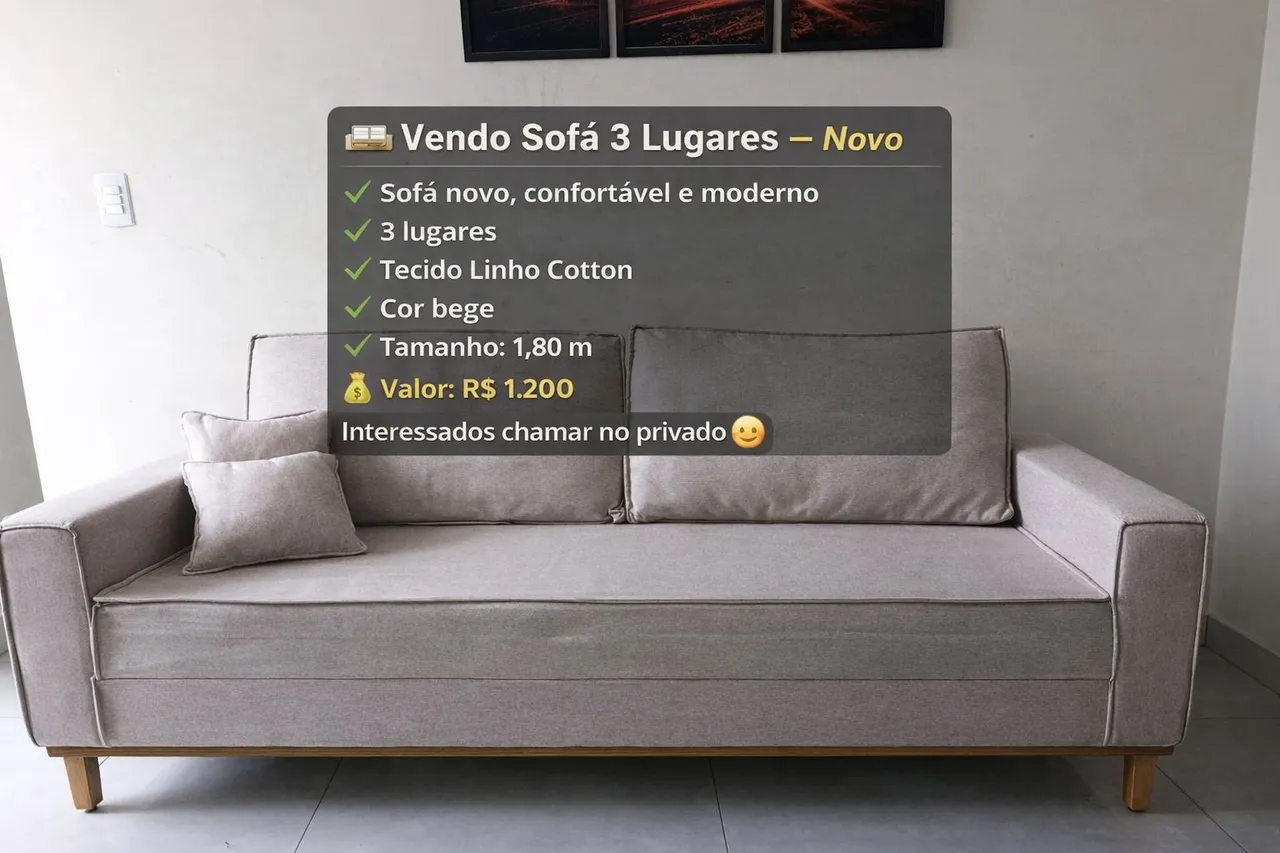 Aconchego e estilo para sua sala! Sofá de 3 lugares, design moderno, tecido linho cotton bege, perfeito para relaxar. Conforto garantido para você e sua família.
