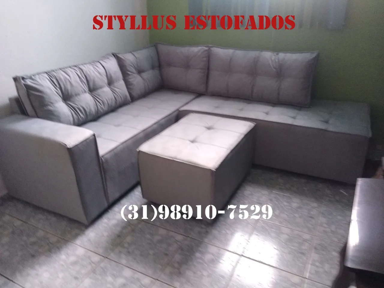 Sofá de canto moderno e confortável, ideal para sala de estar. Acompanha puff. Design elegante e cores neutras que combinam com qualquer ambiente. Por R$1799, a vista ou R$1999, no cartão de crédito entregamos em toda a BH e região encomenda através do whatsapp (31)... ver número
