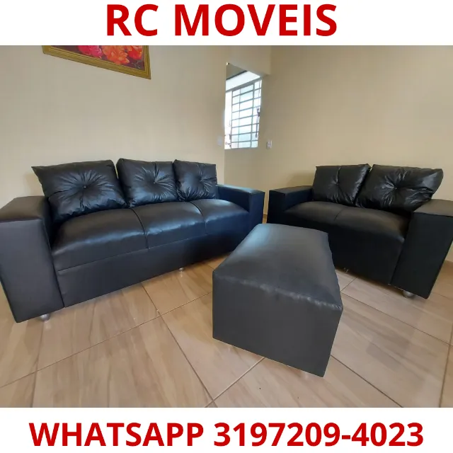 Conforto e sofisticação para sua sala com o Sofá de Couro Sintético 3 e 2 lugares com puff. Produto direto da fábrica, com acabamento impecável e alta durabilidade.