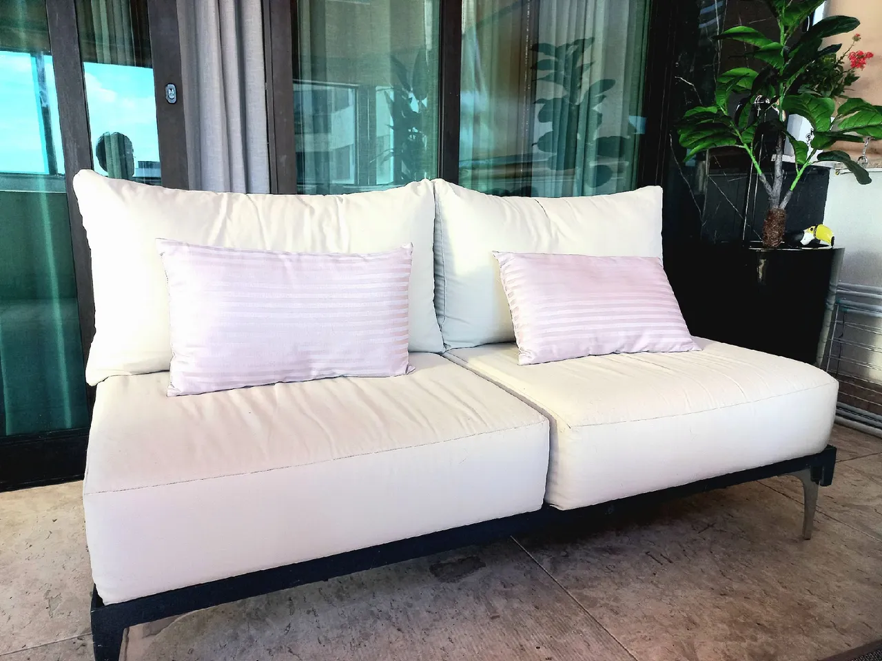 Sofá duplo branco com design moderno e elegante. Ideal para ambientes externos que buscam conforto e sofisticação. Armação em ferro e tecido impermeável e estofado extremamente conservado.