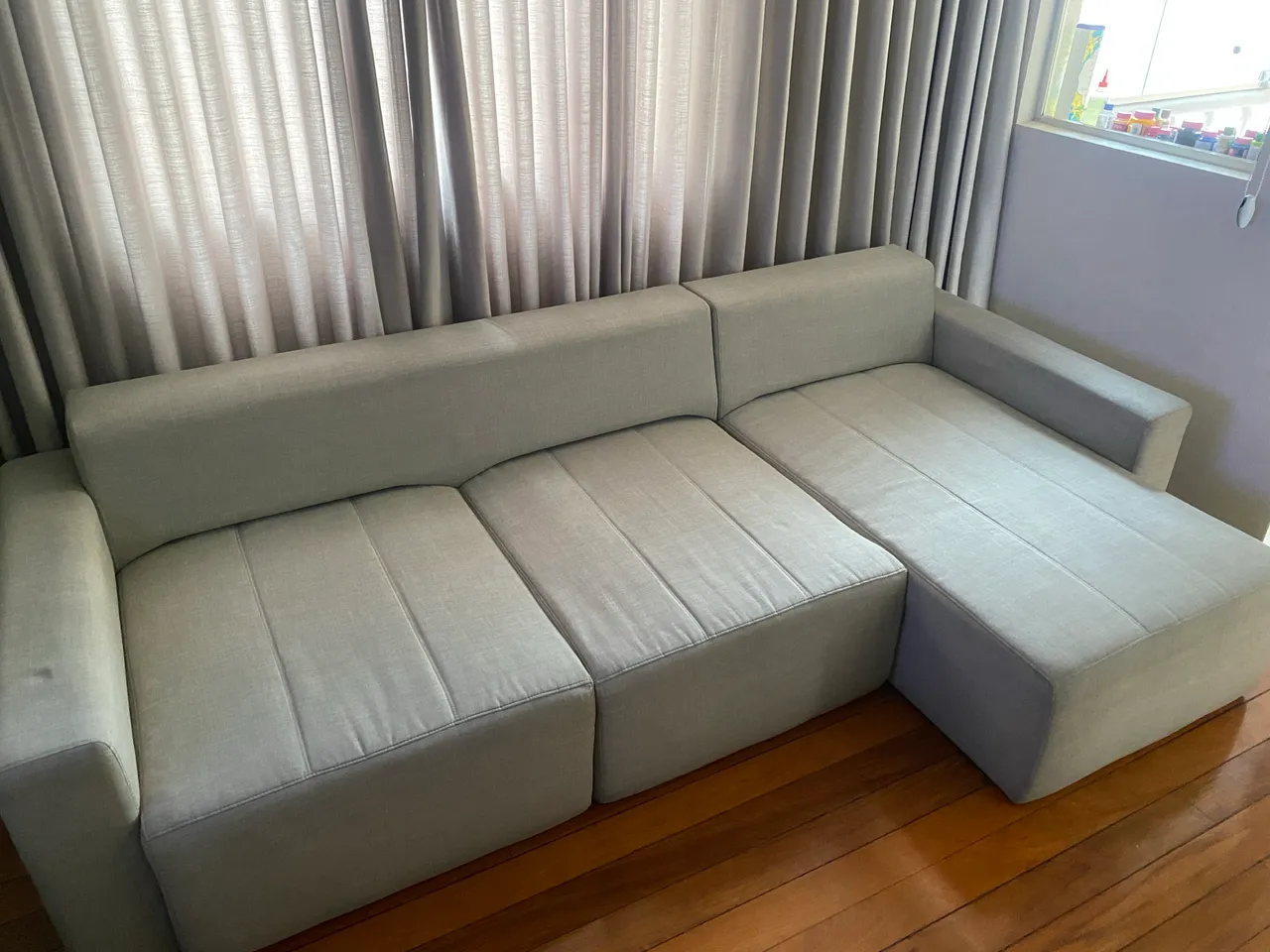 Sofá de linho retrátil na cor cinza, perfeito para sua sala. Conforto e elegância em um só produto! Sem rasgos, tecido em bom estado, espuma em bom estado, lavado e limpo. Os 3 assentos são retrateis. 2,75 de comprimento 1,75 largura
