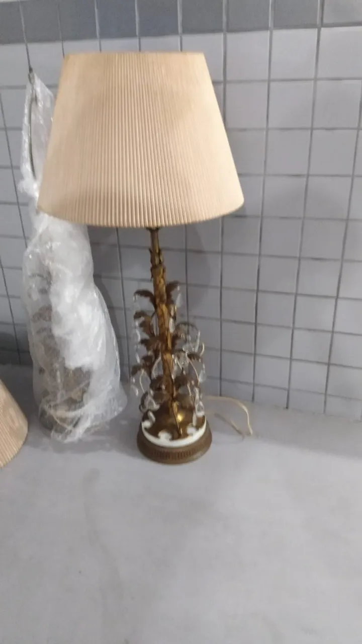 Luminária de mesa em estilo vintage, com base em metal dourado e cúpula em tecido bege. Ideal para decorar a sua sala de estar ou escritório com um toque clássico e elegante.
