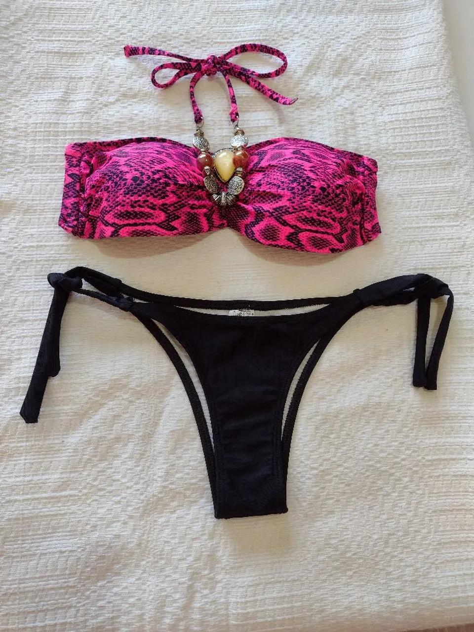 Conjunto de biquíni perfeito para um visual moderno e cheio de personalidade. Top com design diferenciado e calcinha confortável. Ideal para curtir a praia ou piscina com muito estilo.