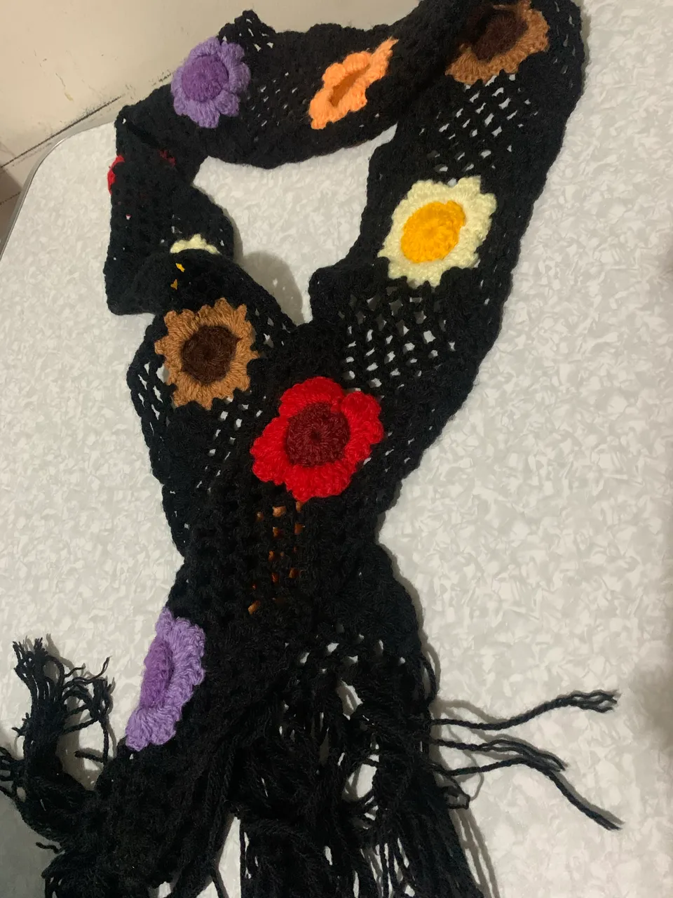 Lindo cachecol preto com detalhes de flores coloridas. Perfeito para aquecer e dar um toque de estilo ao seu visual. Feito com materiais de alta qualidade e design exclusivo.