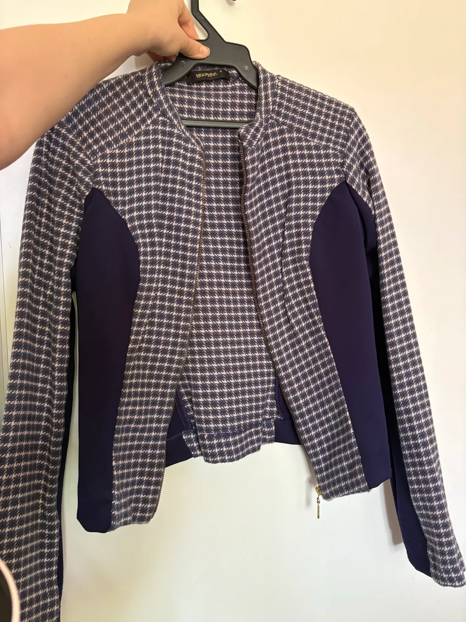 Linda jaqueta feminina azul com detalhes em tecido diferenciado. Design moderno e confortável para diversas ocasiões.