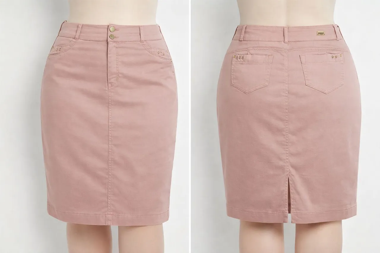 Saia Plus Size. Tam 50. Em brim, cor Rosê. Com elastano.