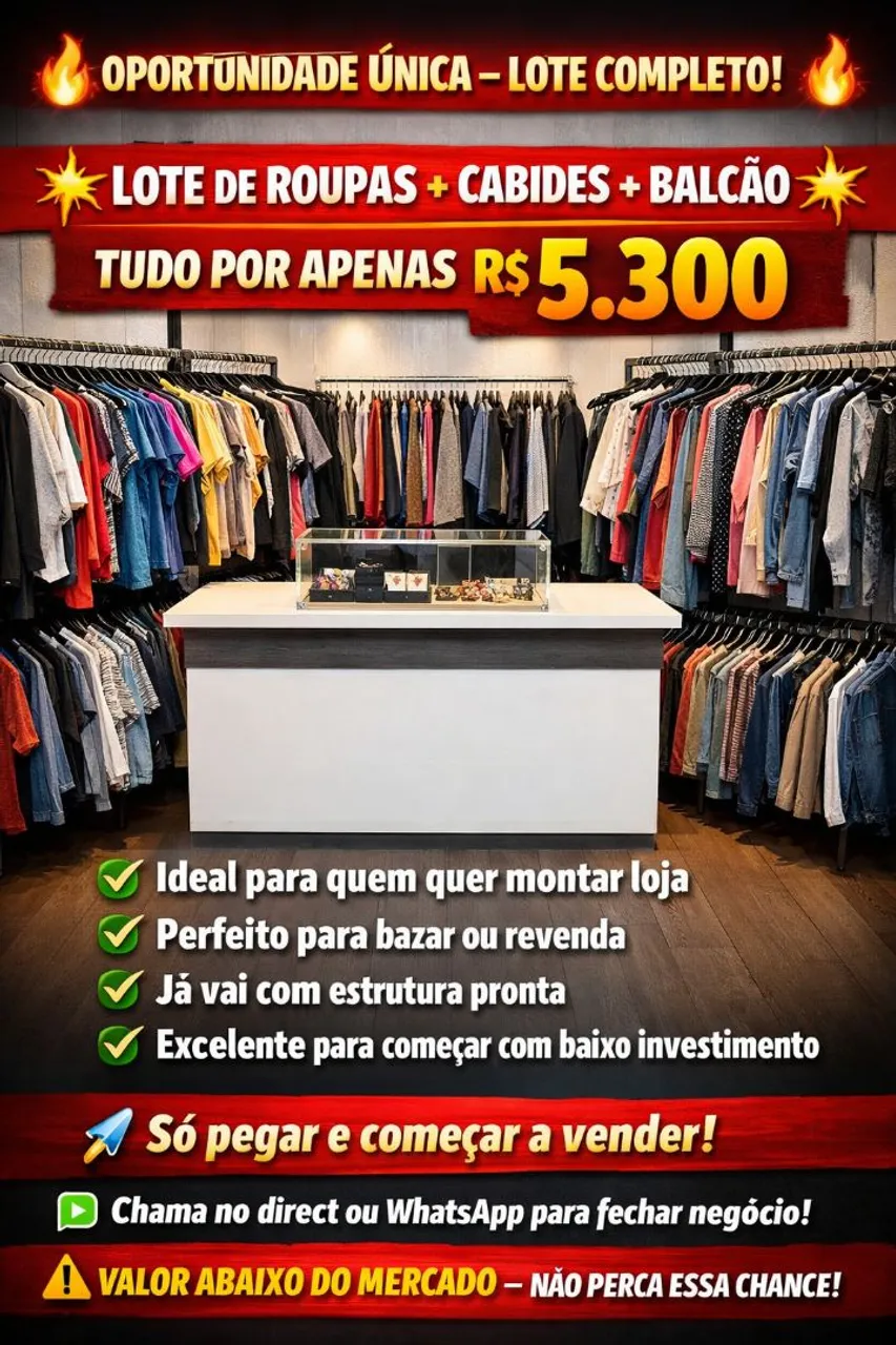 Aproveite esta oportunidade única! Lote completo de roupas, cabides e balcão, tudo por um preço incrível. Ideal para quem quer começar um negócio de moda com baixo investimento.