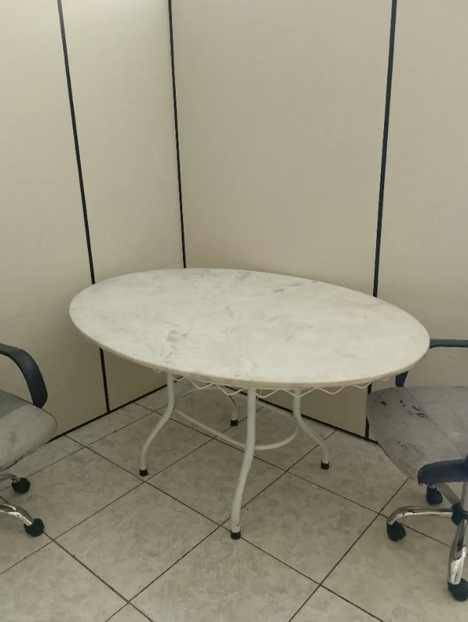 Linda mesa de cozinha com tampo em mármore branco, ideal para dar um toque de elegância e sofisticação ao seu ambiente. Design moderno e funcional, perfeita para refeições e momentos de convívio.