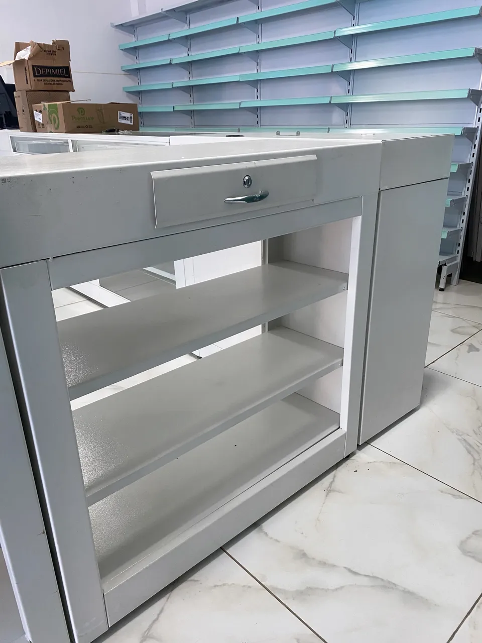 Balcão de metal resistente e espaçoso, ideal para otimizar o atendimento em seu comércio. Design moderno e funcional, com gaveta para organização de itens e prateleiras para exposição de produtos. Perfeito para diversos tipos de estabelecimentos comerciais!