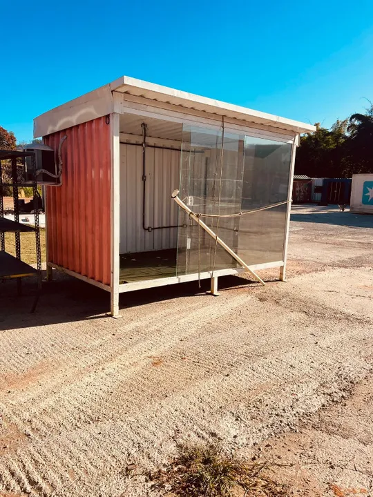 Contêiner tamanho frente 3.55m, lateral 2.20m, altura 2.65m (pé 0,28) em bom estado de conservação, com toda parte elétrica pronta, piso, frente e porta de vidro e com ar condicionado instalado.