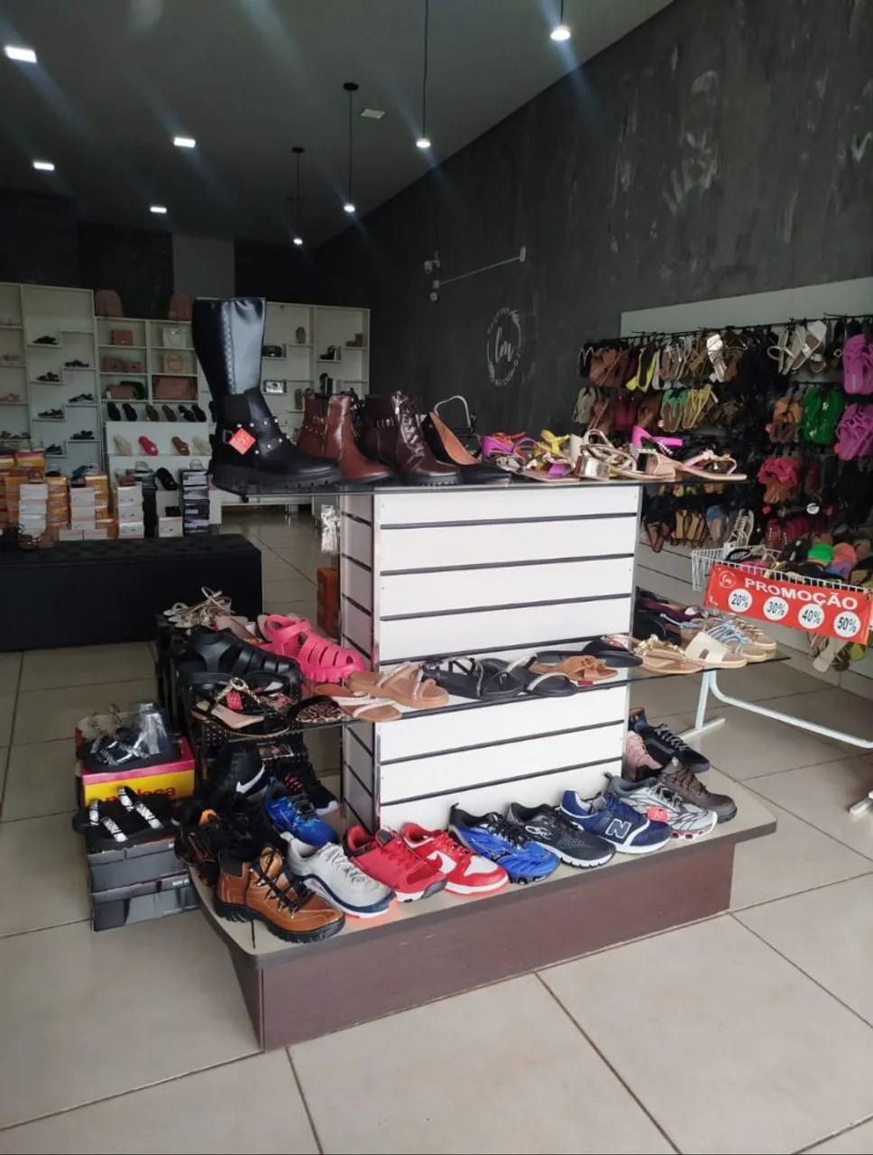 Loja montada com tênis, rasteirinha, sandálias.saltos e acessórios