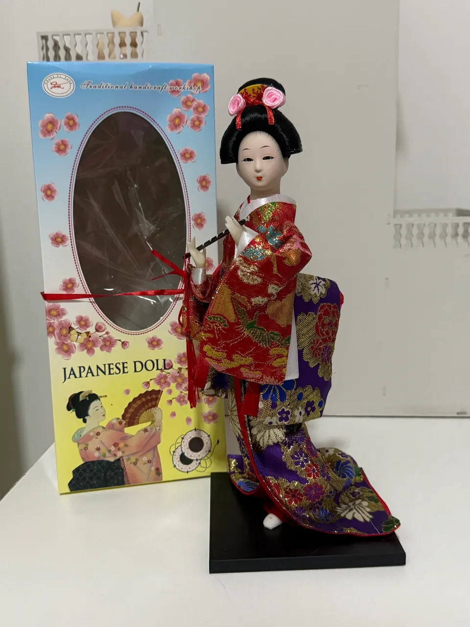 Linda boneca japonesa de artesanato, ricamente vestida com um quimono colorido. Uma peça de colecionador que adiciona um toque cultural e elegante à sua coleção.