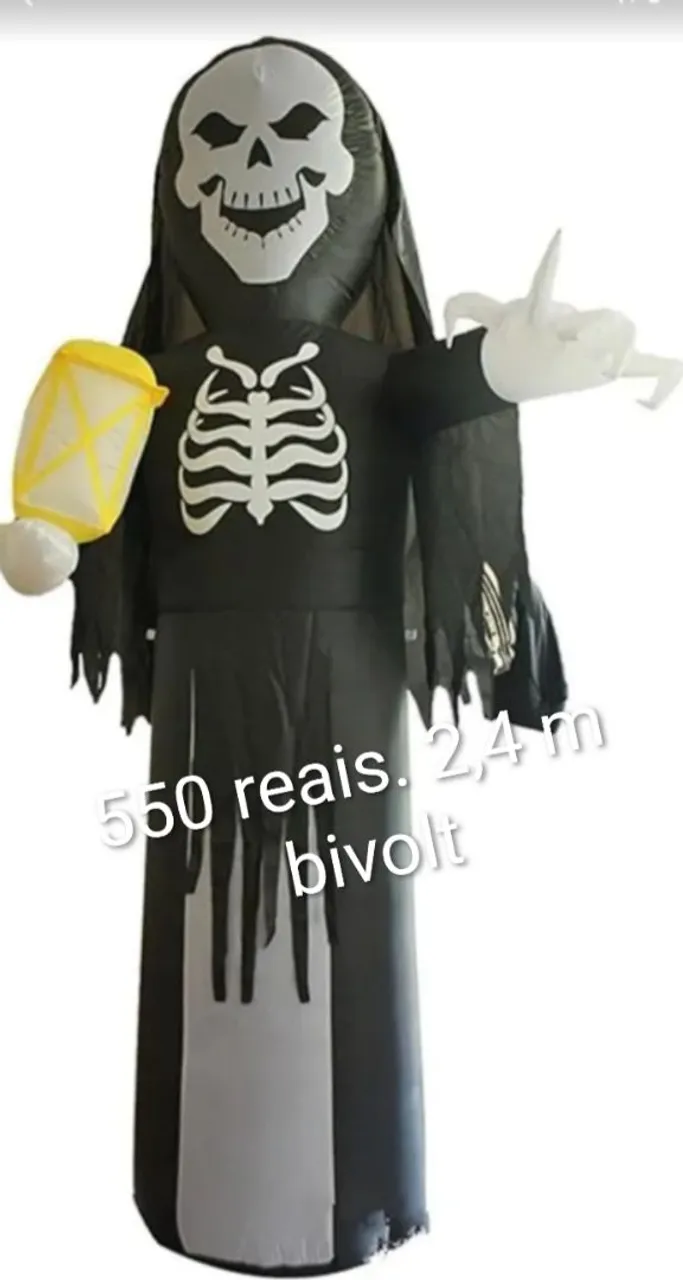 Decoração de Halloween inflável de 2,4 metros, ideal para festas e eventos temáticos. Design de esqueleto com lanterna, bivolt.