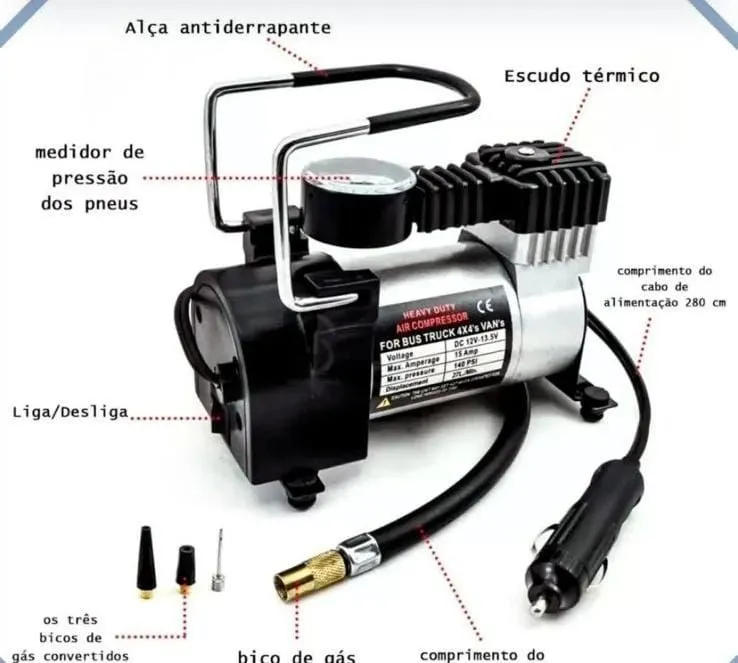 Compressor de ar para carros para calibrar pneus e encher bolas. Com medidor de pressão, bicos adaptadores e fácil de usar!