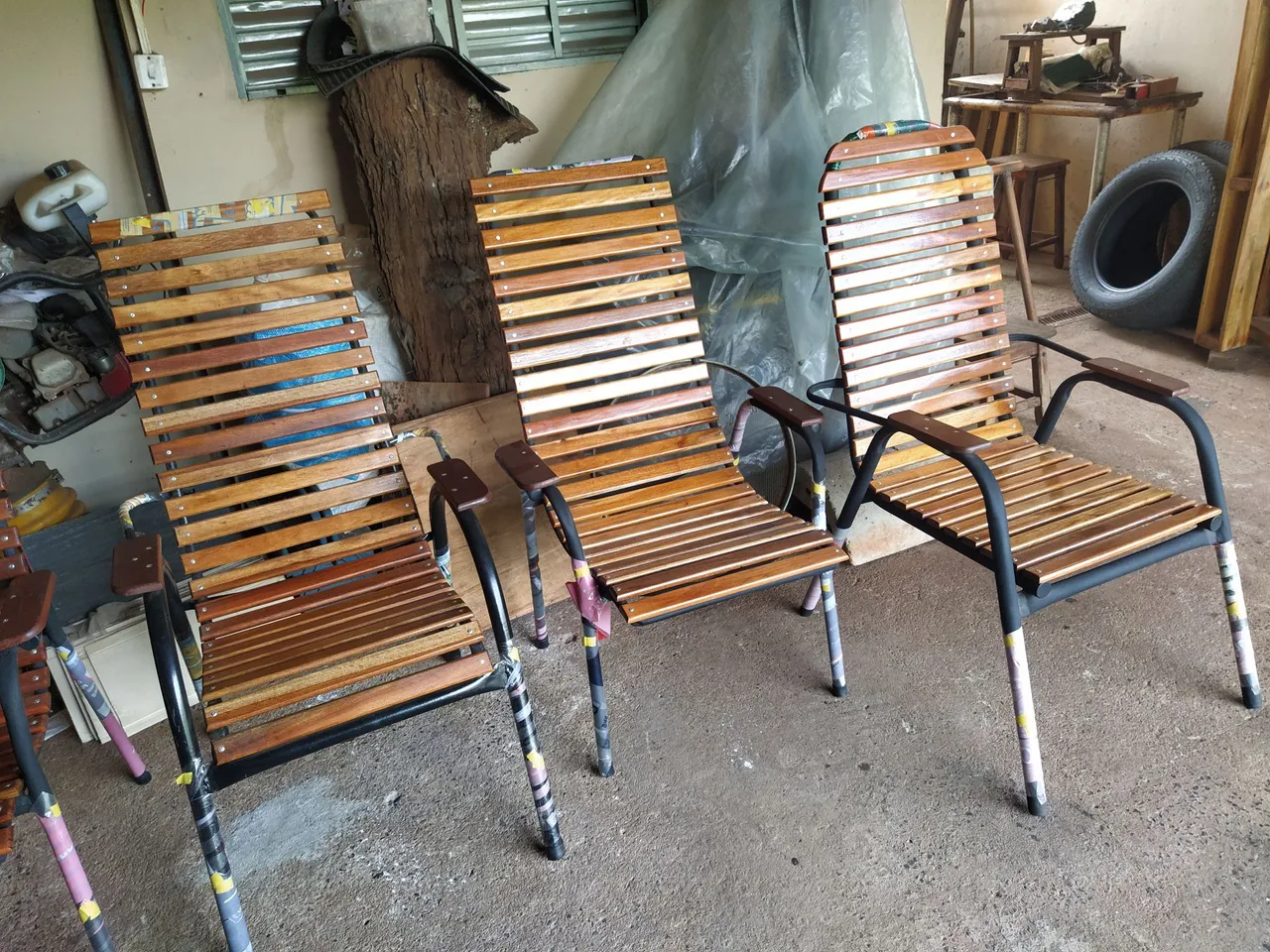 Cadeiras de descanso com ferro e madeira. Angelin vermelho, cupiuba, Angico e demais madeiras com peroba e perobinha são usadas para fazer as cadeiras, há variação de cores ou tons