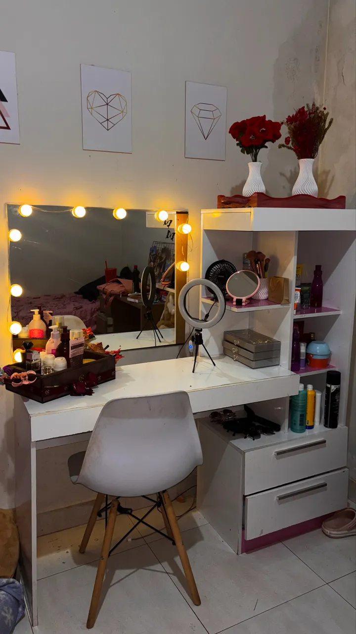 Linda penteadeira com espelho e prateleiras, perfeita para organizar seus cosméticos e maquiagens. Design moderno e funcional, ideal para quem busca praticidade e beleza no dia a dia.