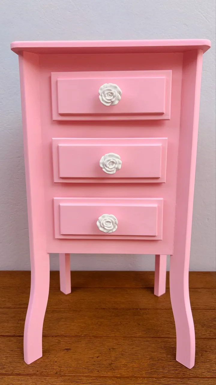 Lindo criado mudo rosa, perfeito para dar um toque especial ao seu quarto. Com gavetas espaçosas e design charmoso, é ideal para organizar seus pertences com estilo e elegância.
