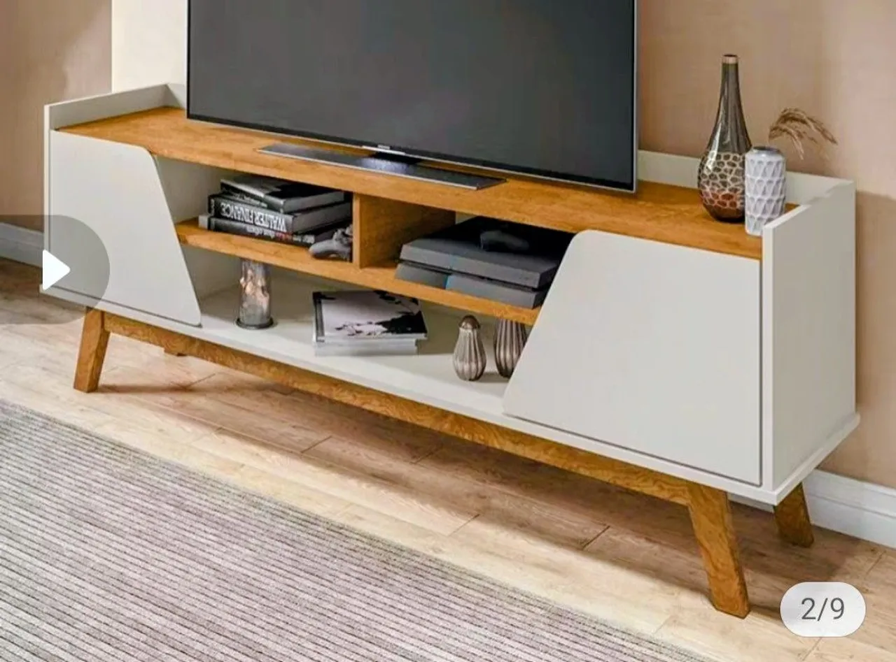 O rack acomoda TVs de até 65 polegadas. Seu acabamento em madeira e pés de apoio conferem um toque de sofisticação ao ambiente.