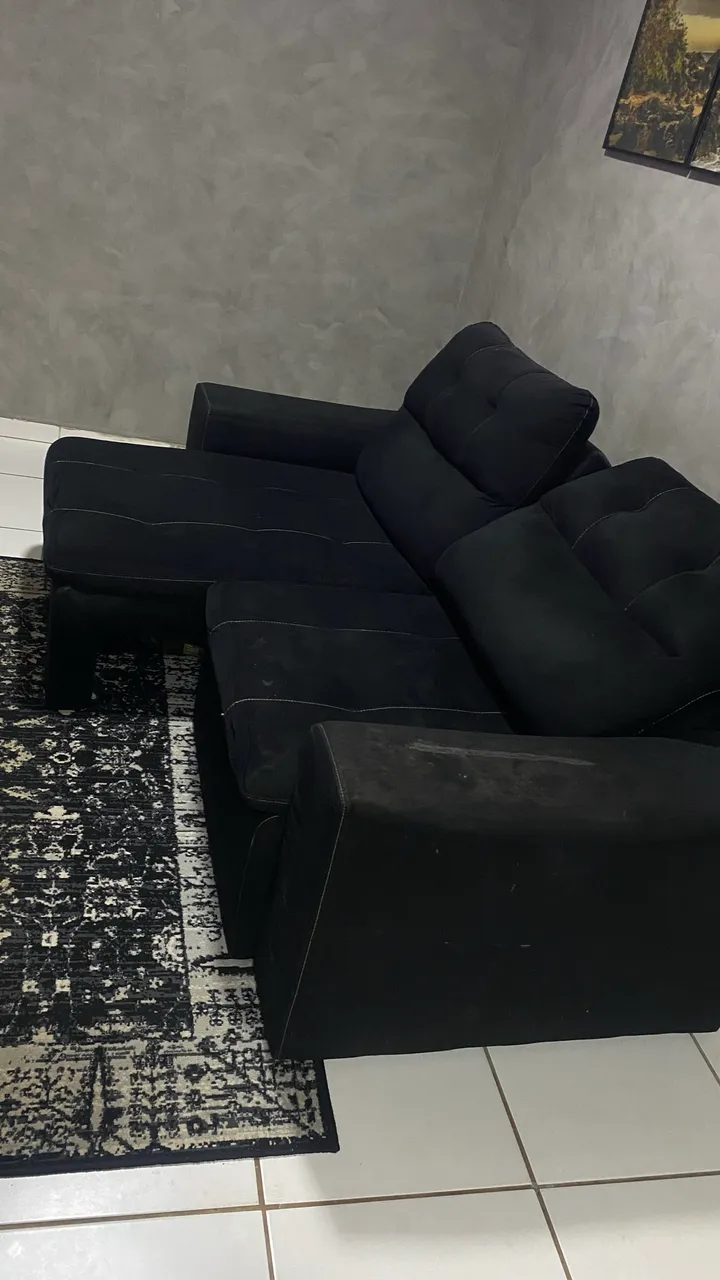 Sofá retrátil reclinável preto, com marcas de uso, mas funcionando normalmente (abrindo o retrátil/reclinável). Brinde 2 almofadas.