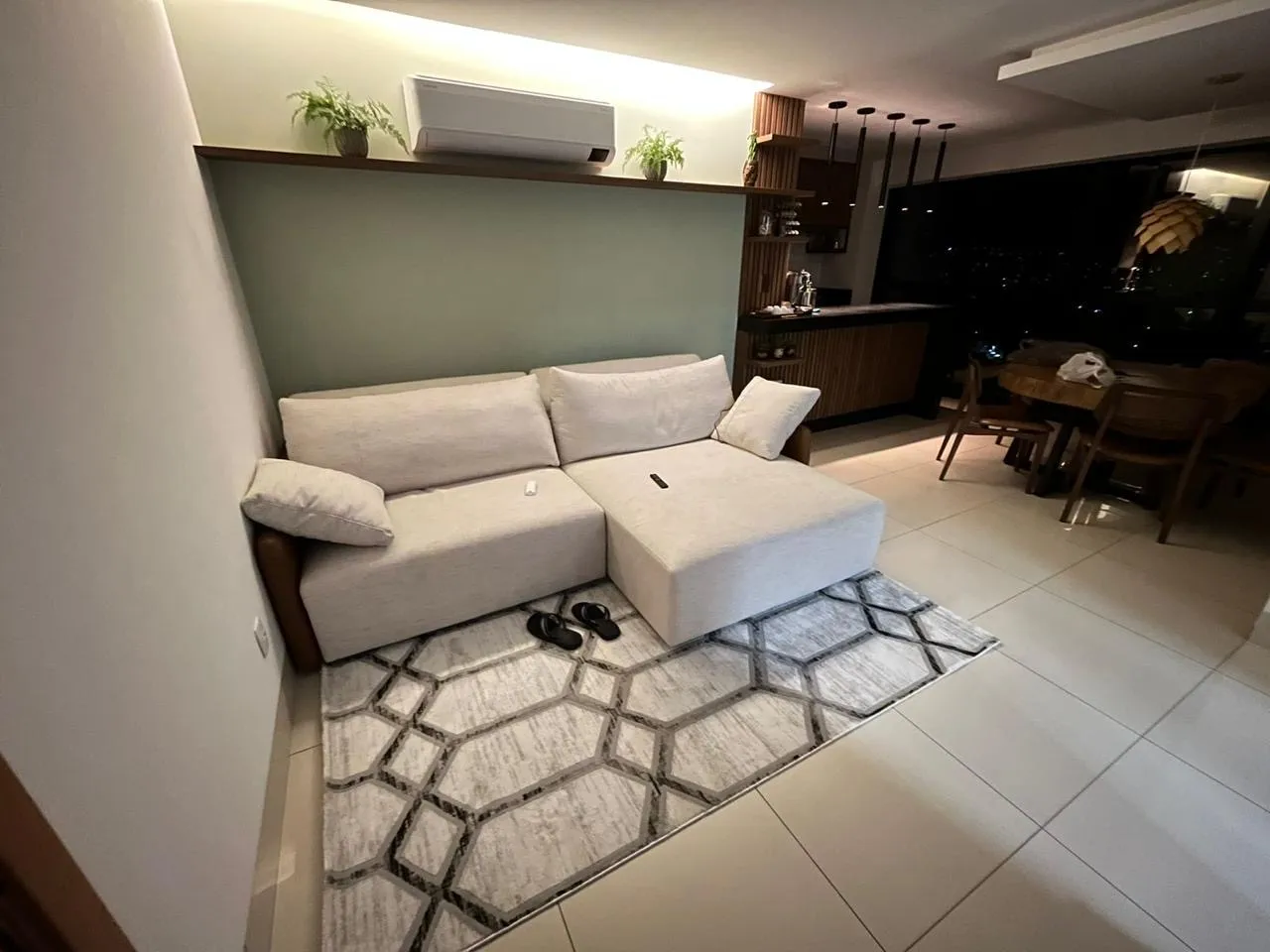 Sofá retrátil (encosto e pés) em linho, 2,6 mt de comprimento, entrada USB lateral para carregamento de celular.