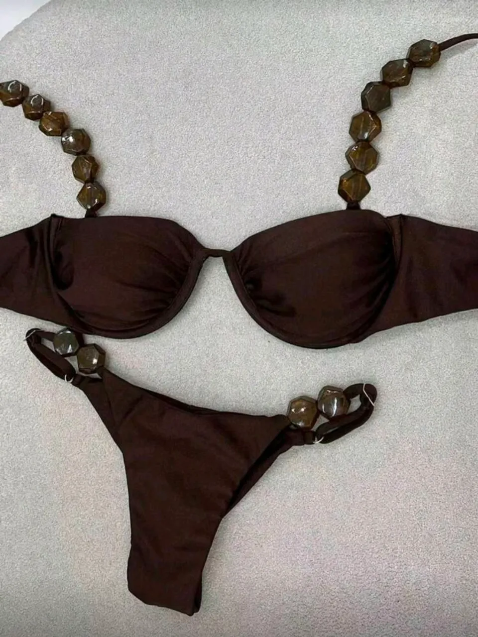 Biquini marrom, tamanho g, com detalhes imitando pedras, muito bonito! O sutiã tem aro e um bojo removível. Está novo! Foi só experimentado.